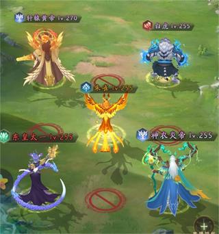 神煞阵型:前排白虎,轩辕,中排青龙,后排神农和东皇太一