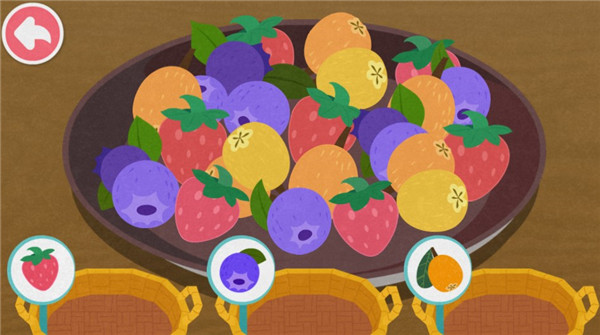 采摘水果——采摘草莓、枇杷和蓝莓,再将它们放进对应的竹篮中(学会分类);