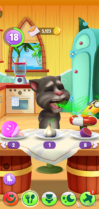 点击这个按键会带汤姆猫到餐厅,桌子上摆着的东西,玩家可以喂给我们汤姆哦。