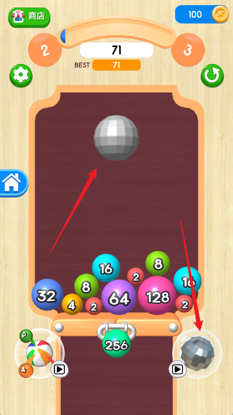 5、右下角的金属球球拥有冲击功能,可以扰动堆叠的球球位置,让合并操作更顺畅;