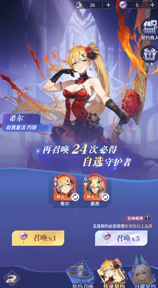 玩家们可以选择自己心仪的阵容,将其核心输出加上另外一个系常用的核心辅助或护盾(伊丽莎白、莱昂、蕾娜等)放在契约水晶的心愿里,每40抽必得其中一个;