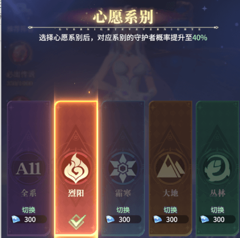 (1)开局完成150次契约召唤左右,左侧就会出现心愿系别,一定要记得选择自己玩的主系,这样抽卡时会更容易抽到所选系别的史诗守护者,获得更多主系的守护之魂