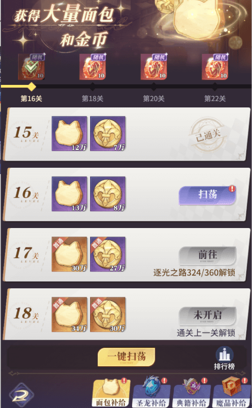 物资补给共包含四部分:面包、圣龙、典籍、魔晶,每天都尽量打到打不了后再扫荡,前期扫荡次数必买满,快速提升战力