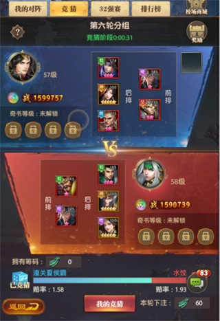 玩家可以根据参赛选手的装备、将印、战法、星阶和战力来判断进行下注,问鼎中原结束后筹码将自动结算为校场声望,可用于校场商店兑换聚贤等道具。