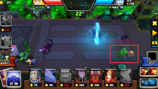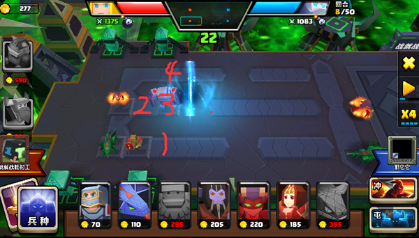 下面进入本文的核心内容,我们先从开局说起。开局造兵在传送门之后的好处已经被广大玩家所知晓,我就不再赘述。不过就算在传送门之后的摆位,依旧有略微差别。如上图,有些玩家喜欢放在最后一排,有些玩家喜欢放2号位或者3号位,而我推荐的位置是1号位。首先假如我们开局要造一个掠命者,那么对于掠命者来说,最大的天敌莫过于大科多,如果我们将掠命者建造在2号或者3号位,那么一旦对面针对型的出科多,我们要么面临崩盘的风险,要么只能退而求其次补一个大肉在传送门前。而建造在1号位则可以为之后的反针对埋下伏笔。无论之后在2号位还是3号位建造大肉来避免科多的针对都是非常有效的。在最后,再来说说为何不讲前排兵种建造在最后一排,首先战就战的AI判定是进入攻击距离后不再移动,自动进入攻击,而一般远程兵种的攻击距离在400左右,如果将肉造在最后一排的位置,那么你的后排输出兵种也只能和前排肉一起建造在最后一排,以400攻击距离的远程+100攻击距离的近战举例,在双方兵线交接后,你的远程兵种将在距离敌方近战250距离的位置进行攻击,距离己方前排的距离则是150。而随后,我们则需要考虑几个兵种的技能,大酋长的粉碎,以攻击目标为中心的250距离,必然能攻击到我们的后排。地狱火的灼烧(烈焰护盾),300的灼烧距离同样能够伤害到我们的后排,除此之外,还有幽冥鬼王,魔导师的烈焰斩等技能都可能再距离过近下伤害到我们的后排,因此本人是不建议将后排输出单位和前排肉建造在同一排的,尤其是对战前期。