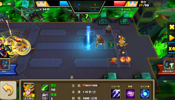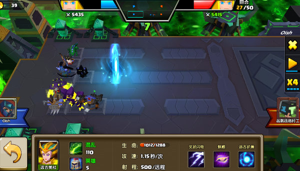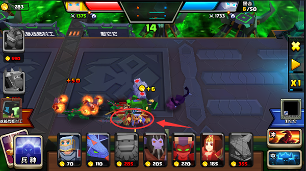 最后来看游戏中后期,在战就战的中后期,双方的阵型基本已经定型,这时候合理的阵型将能够让你的兵力发挥事半功倍的效果。如上图的对战,在单波兵的前提下,必定是中路牛头和对方无名恐怖者对战,之后右方的复活狼骑攻击无名公布者,魔法攻击打重甲的优势。下路则是总指挥对战地狱炎,普通打中甲有130%的加成。而后排上,左侧方美杜莎,死灵法和赤色飞龙都会优先攻击牛头,牛头死亡后攻击死灵法召唤的骷髅,最后才是攻击掠命者。而下路的黑鸟(毁灭灾星)同样会优先集火牛头,这就为总指挥击杀地域炎提供了时间,由于左侧方的黑鸟是放在地域炎之前的,战就战中一个建筑摆位的距离在140码左右,黑鸟的攻击距离是450因此在兵线交接后,黑鸟仅仅位于地域炎身后100-150的距离,总指挥在击杀地域炎之后就会立刻转火黑鸟。从上图中可以看出右侧放的兵力比左侧方甚至要低20,然而由于阵型摆位的优势,双方的实际战力右侧方玩家至少要强10%。