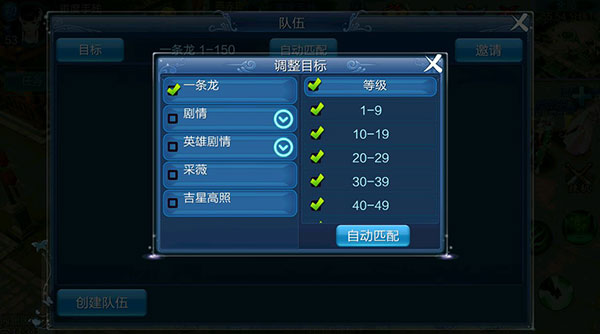 想组队做任务却没有认识的小伙伴?游戏中有强大的自动匹配功能,打开组队面板,在“目标”选择要参加的活动,就能一键组队!