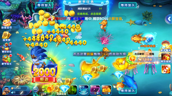 3、当然,一开始游戏时的金币是很少的,需要稳扎稳打打鱼升级的过程中不断赚取金币。先使用低级炮(例如5-15的炮台)捕获一些小鱼,偶尔打些打鱼来寻找感觉,熟悉各种鱼儿的分值后再进行适当的捕鱼调整。