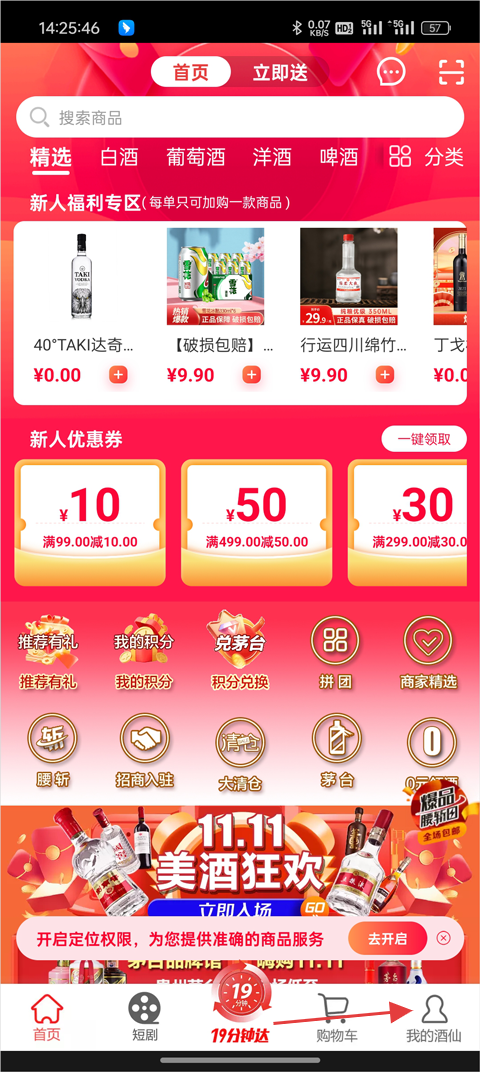 1、打开酒仙App,进入首页后点击右下角的【我的酒仙】;