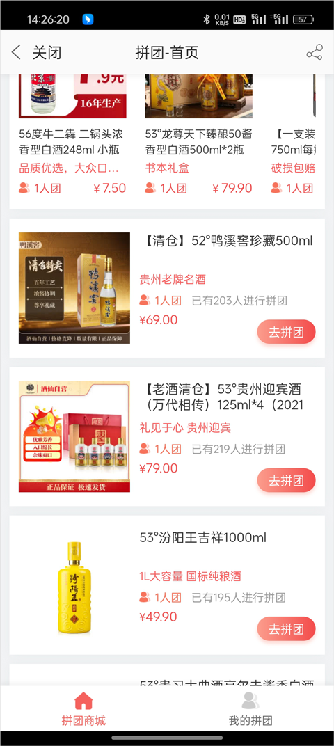 3、这里会展示各类正在进行的拼团活动,挑选你感兴趣的商品后点击【去拼团】;