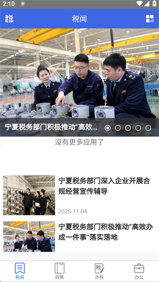展示宁夏税务部门的工作动态,如深入企业开展合规经营宣传辅导、推动【高效办成一件事】落实落地等新闻,让用户及时了解税务部门的服务举措。