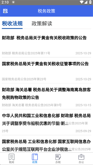 包含【税收法规】和【政策解读】两个分类,呈现最新的税收政策公告,为用户提供权威的税务政策参考。
