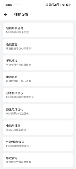 1、打开隐启设置App,在主页可以看到很多功能,如快速开启性能模式,显示状态栏等