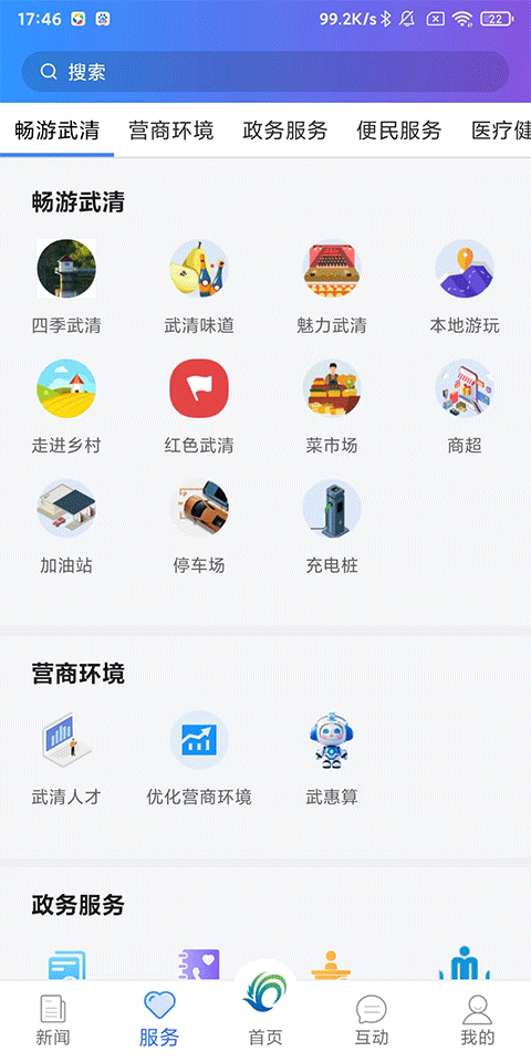 2、服务:包含畅游武清攻略服务、营商环境服务、政务服务、便民服务、医疗健康......