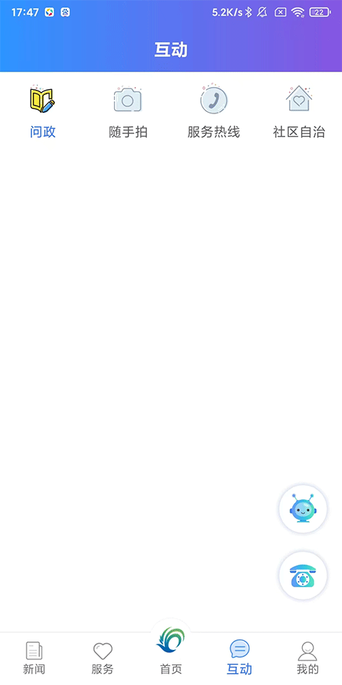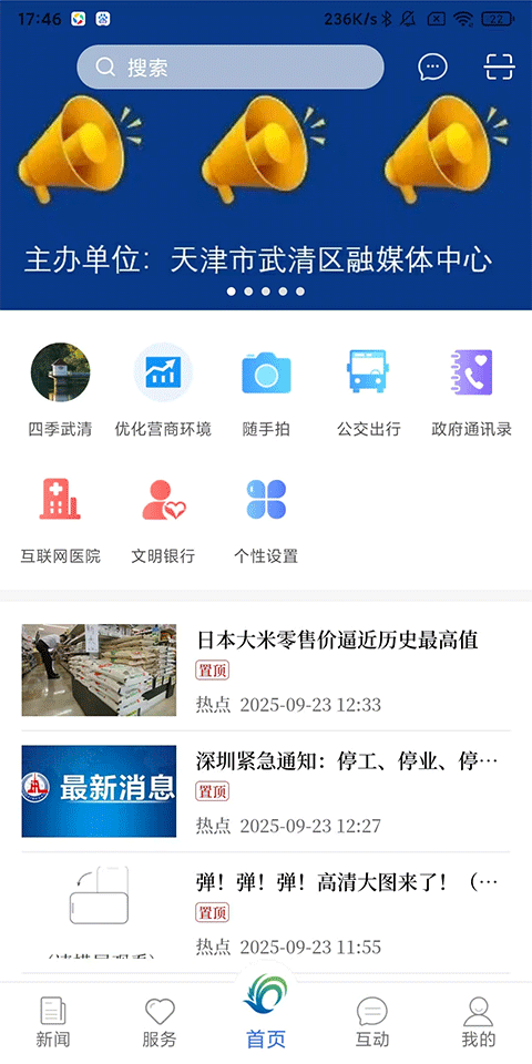 3、首页:热点新闻、随手拍、 公交 出行、政府通讯录、文明银行、互联网医院,常用功能快捷入口集成于此;